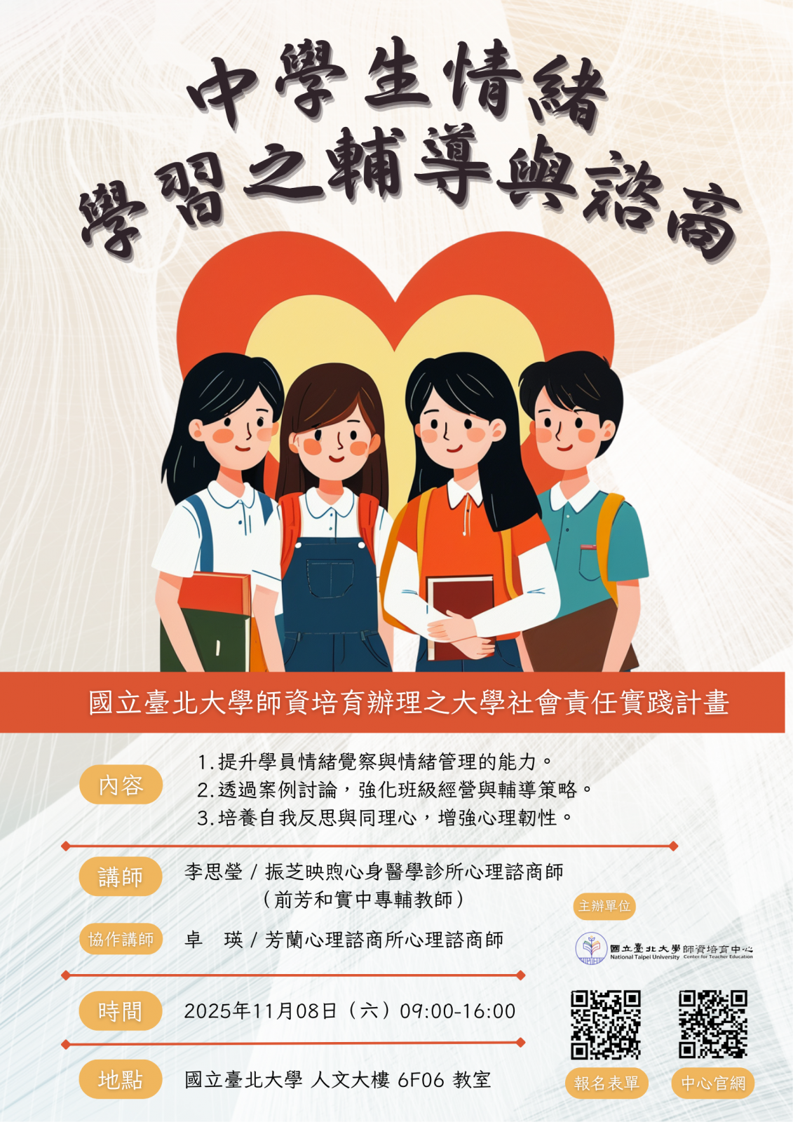 二、因應Z世代中學生處於科技手遊與網路社群媒體無所不在之生活環境,所衍生之情緒調適、心理適應、人際互動及學習等挑戰,該工作坊在強化教師及師資培育生之諮商輔導技能,協助中學生培養社會情緒學習(SEL,Social Emotional Learning)能力,並提升其學習效能。課程內容聚焦兩大主題:「青少年情緒與學習輔導」及「青少年情緒管理與諮商技能」,兼顧理論與實務,以回應教育現場需求。